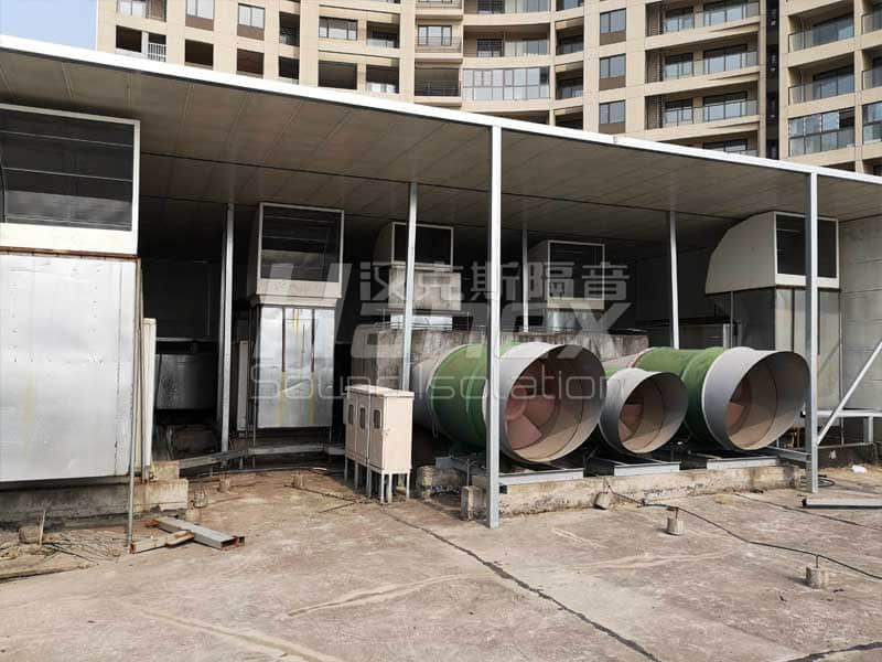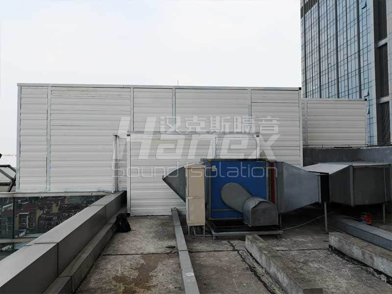 1、經(jīng)過漢克斯隔音技術(shù)人員現(xiàn)場踏勘及結(jié)合業(yè)主所提供的資料,裙房屋面西北角有P4~P8排油煙風機房,保證其工作運行時產(chǎn)生的噪聲不往外擴散,對P4~P8排油煙風機進行整體安裝隔聲罩。