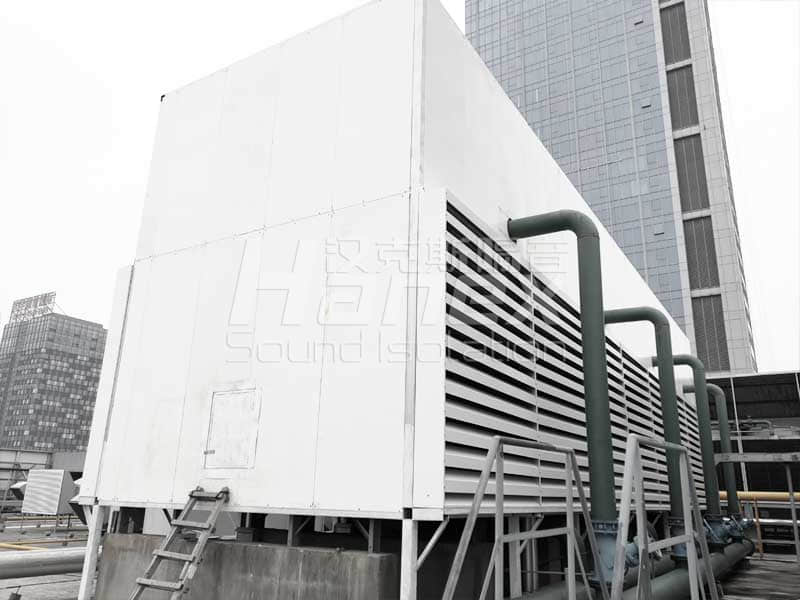 1、經(jīng)過漢克斯隔音技術(shù)人員現(xiàn)場踏勘及結(jié)合業(yè)主所提供的資料,裙房屋面上T4冷卻塔設(shè)計安裝隔聲棚。