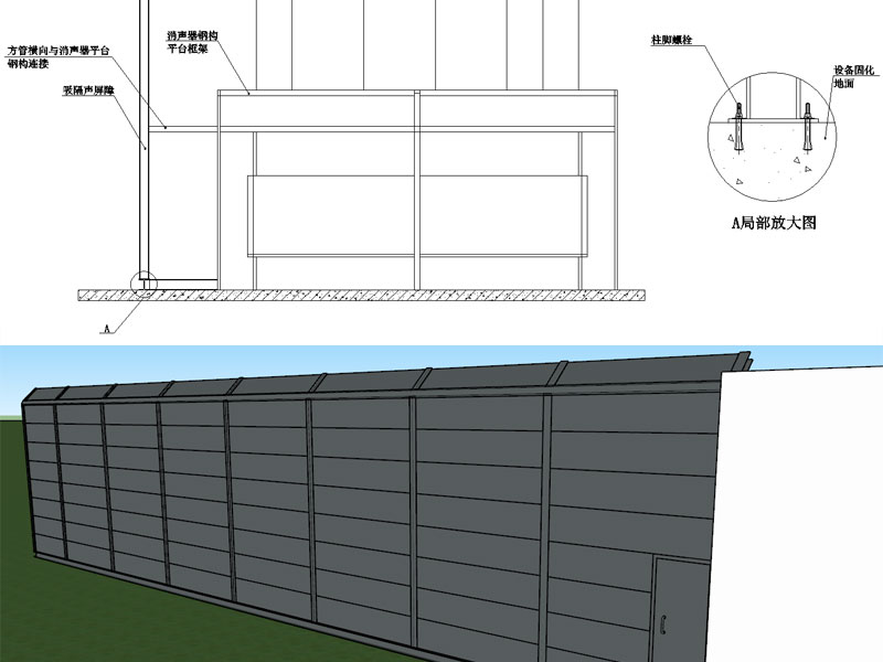 5、吸隔聲屏障立柱采用HW125型鋼,底部找平基礎(chǔ)采用HW150型鋼,立柱底部與型鋼基礎(chǔ)進(jìn)行焊接,立柱間距2.5米,型鋼基礎(chǔ)底部預(yù)埋螺栓與設(shè)備固化地面進(jìn)行連接,底部與設(shè)備基礎(chǔ)進(jìn)行橫向連接,同時(shí)為增加其抗風(fēng)性能,吸隔聲屏障中部與排風(fēng)消聲器平臺進(jìn)行橫向連接。